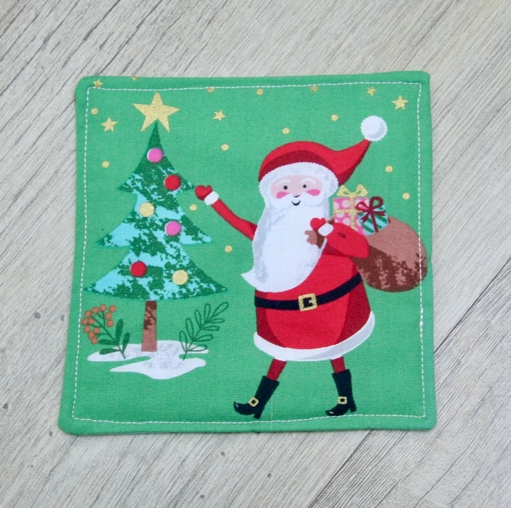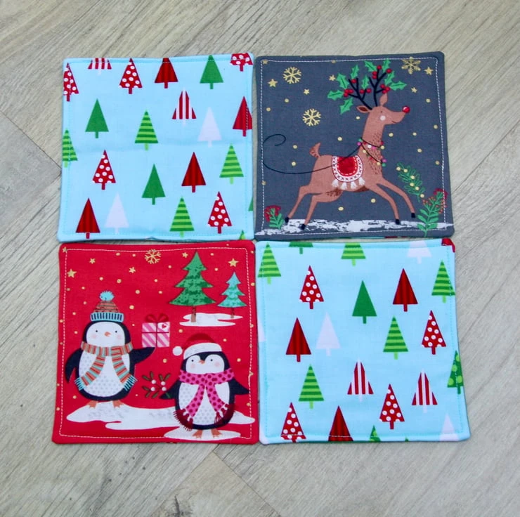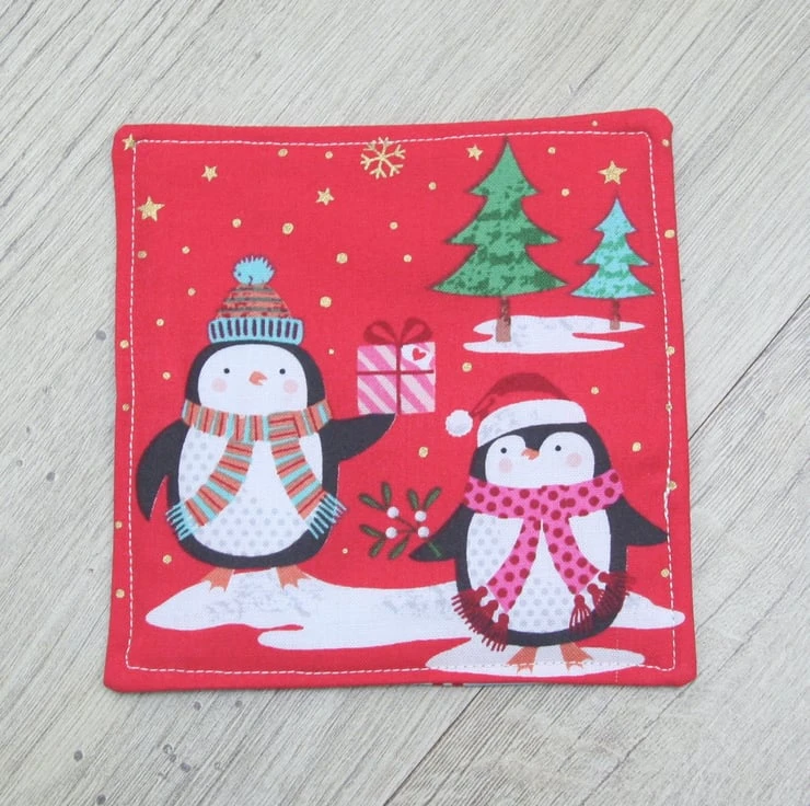 The main material is 100% high quality cotton each featuring a different festive picture, a Polar bear by a Christmas tree, a couple of Penguins holding a present, a prancing Reindeer with Holly antlers and a jolly Santa carrying his sack. They are backed with a light blue 100% high quality cotton, with a pattern of Christmas Trees. There is a layer of polyester eco-friendly wadding in the centre made from recycled plastic bottles. The layers are stitched together, with a layer of top-stitching around the edge.