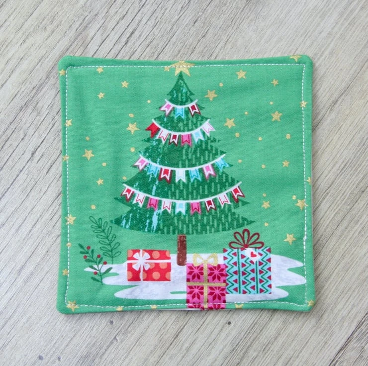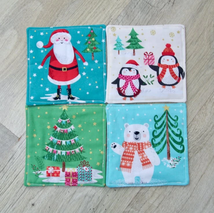 The main material is 100% high quality cotton each featuring a different festive picture, a Polar bear with a Christmas tree, a couple of Penguins holding a present, a brightly decorated Christmas tree with some presents and a jolly Santa. They are backed with a cream 100% high quality cotton, with Santa’s and Christmas Trees dotted around. There is a layer of polyester eco-friendly wadding in the centre made from recycled plastic bottles. The layers are stitched together, with a layer of top-stitching around the edge.