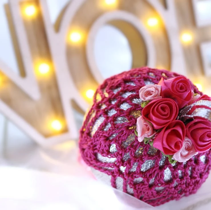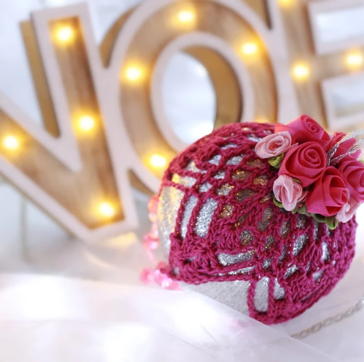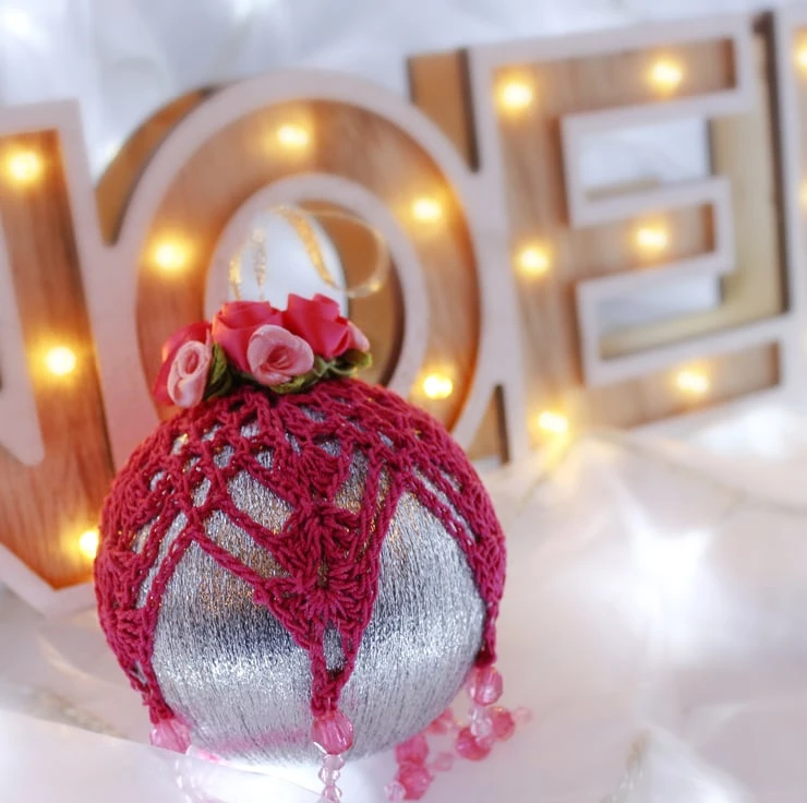 A large silver thread bauble decorated with fine cerise pink coloured hand crocheted lace, with cerise and light pink satin roses around the top, and cerise and light pink coloured multi-faceted acrylic beads hanging from the crochet lace points, the perfect Christmas decoration for hanging on your Christmas tree.