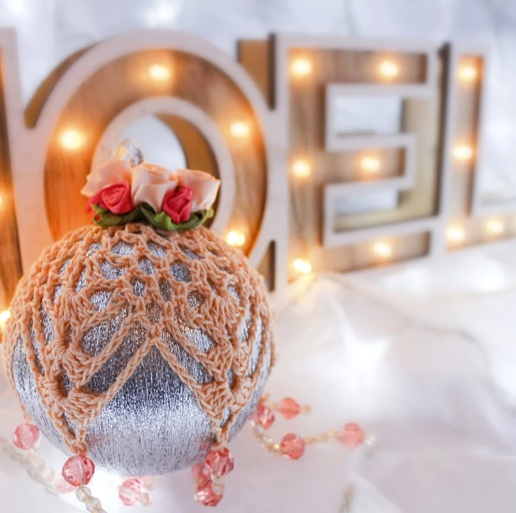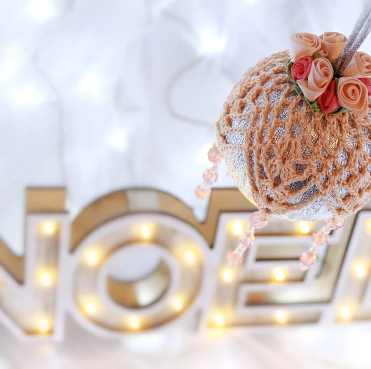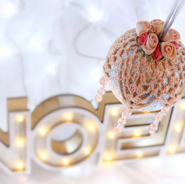 A large silver thread bauble decorated with fine peach coloured hand crocheted lace, with peach and dark peach satin roses around the top, and peach and dark peach coloured multi-faceted acrylic beads hanging from the crochet lace points. The perfect Christmas decoration for hanging on your Christmas tree.