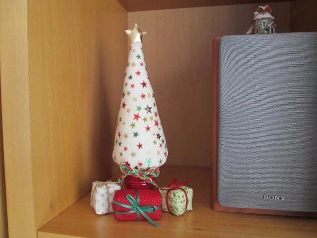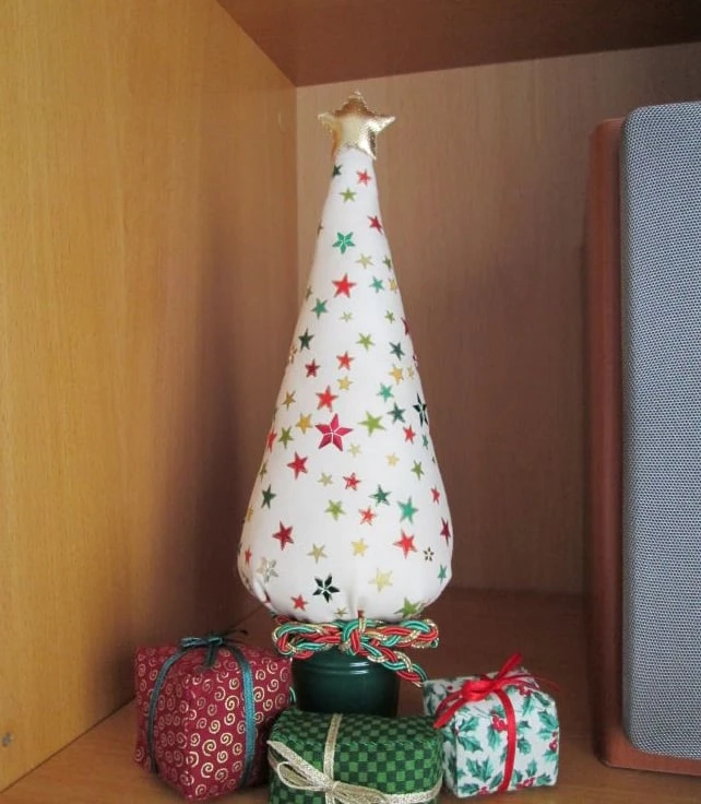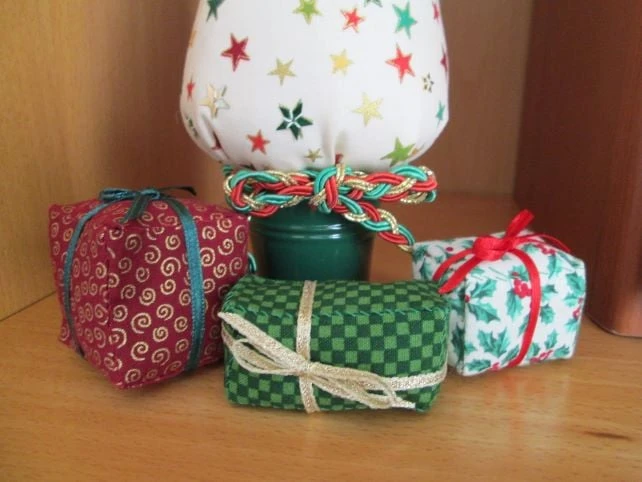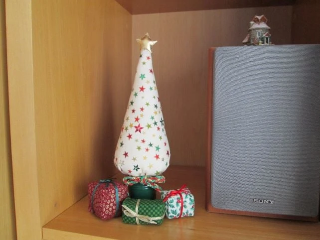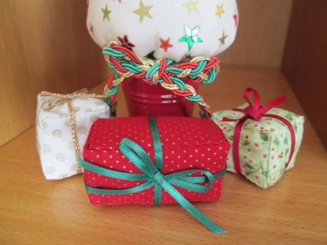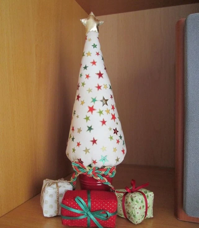 Miniature Christmas Tree in a pattern of festive stars on cream with some stars picked out in star sequins. Set in either a red or green metal bucket and finished with a plaited braid bow, each tree comes with a set of hand sewn mini fabric parcels to complete the look. Stands approximately 28 cm high. Two available, one in a red bucket, the other in a green bucket.