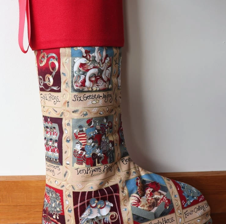 This Fabric shows pictures of the twelve days of Christmas, the colours are very rich, the collar is a Christmas red fabric.