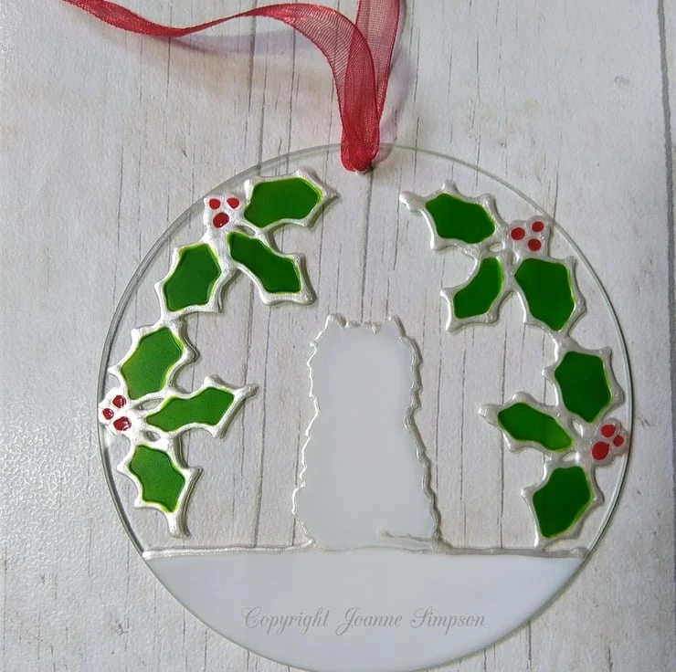 This is a 10cm glass circle. A lovely Westie sits in the snow surrounded by Holly. A single name upto ten letters including spaces can be added to the snow, or it can be left blank. Finished with an organza ribbon for hanging. A beautiful addition to any tree or window this Christmas. These decorations make a lovely gift. Hand painted West Highland White decoration. Each sun catcher is individually hand painted and unique.