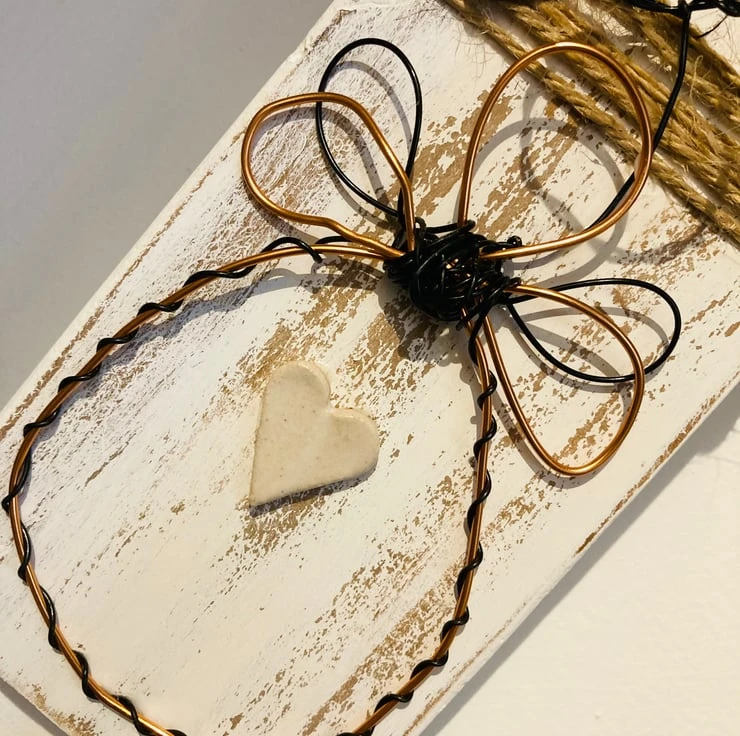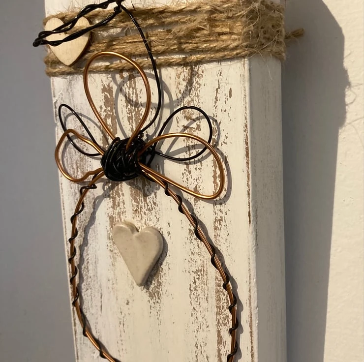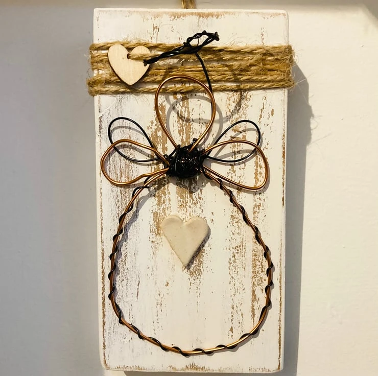 Wire art angel Christmas decoration. Hand made wire art Christmas decoration with hand made Ceramic Love heart.