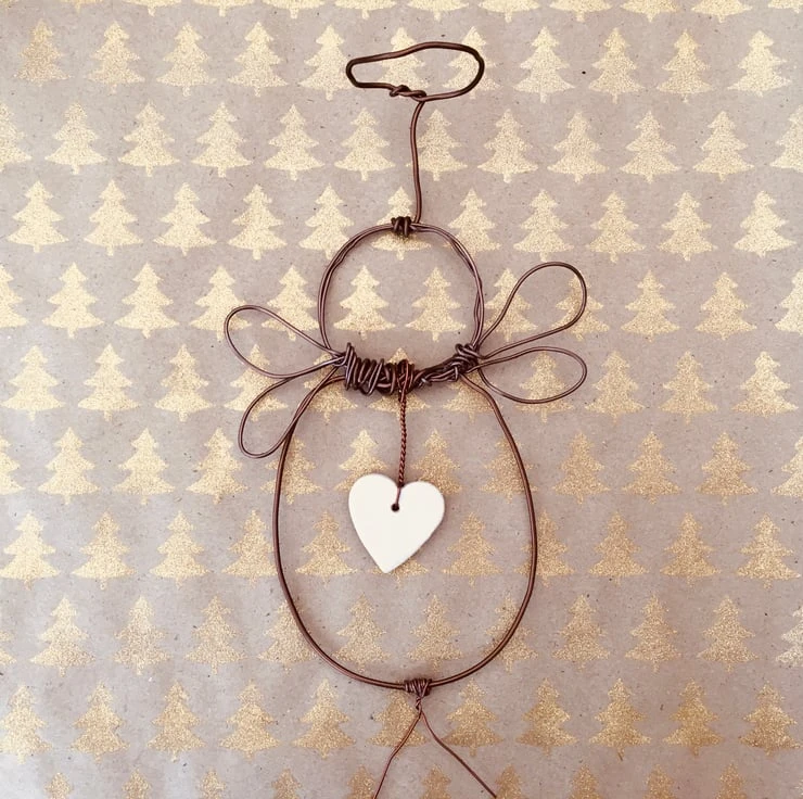 This pretty piece is sculpted from a dark brown camel wire formed into a Christmas angel design. The Angel can be attached to your Christmas tree using the wire fastened to the bottom of the angel, or hung from the enclosed twine or hung around your home to give a festive feel. I have attached a white heart onto the centre of the angel.