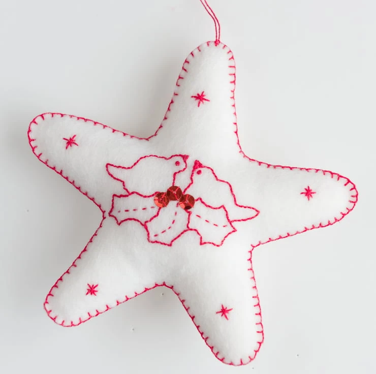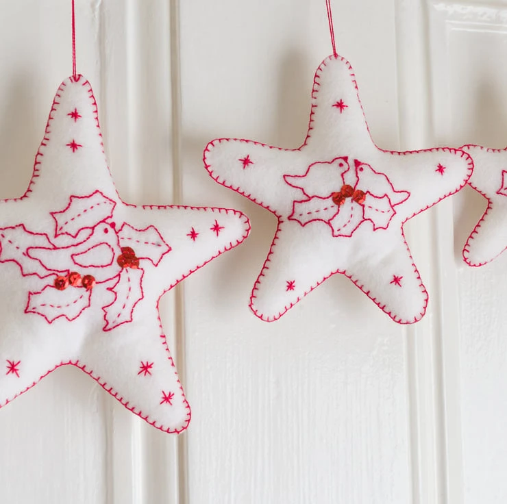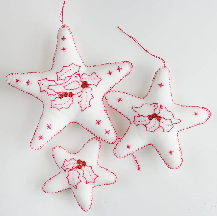 This is a set of 3 stars in 3 different sizes and hand embroidered with 3 different but themed designs. They are made of 100% wool felt, hand embroidered with red perle cotton, and have a little added sequin sparkle as an accent to the embroidery designs.