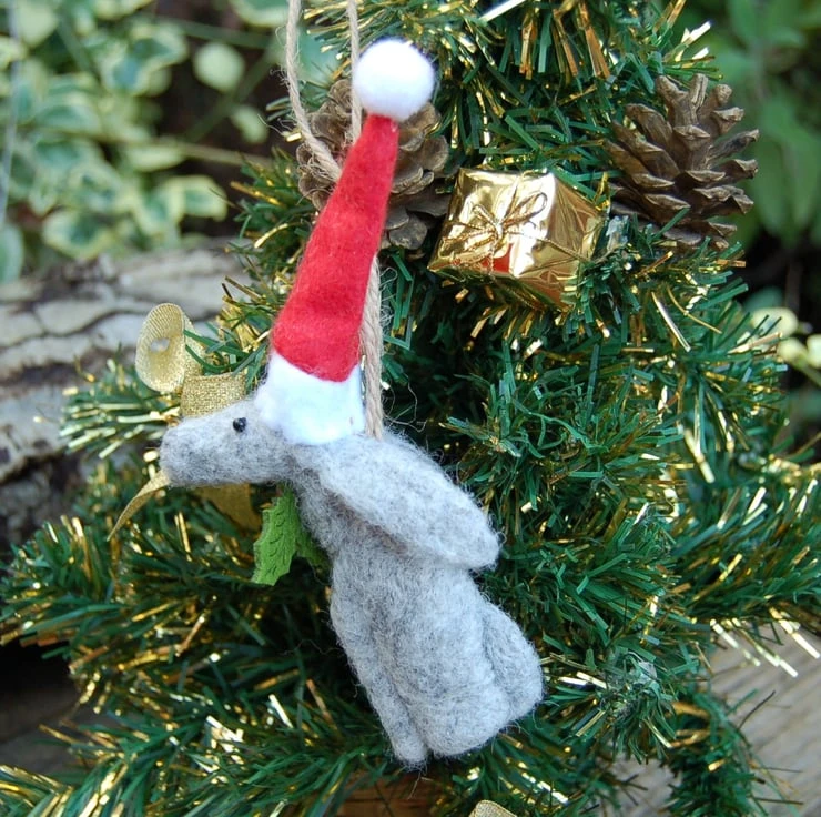 A cute Christmas Tree bauble. A moon gazing hare made from unspun wool fibres wearing a red Santa hat. The hare is available in either winter White or Grey. Choose from the drop down list.